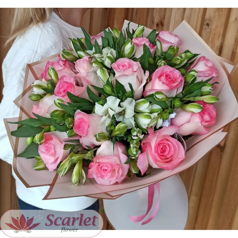 11 роз, 9 альстромерий, упаковка, лента.