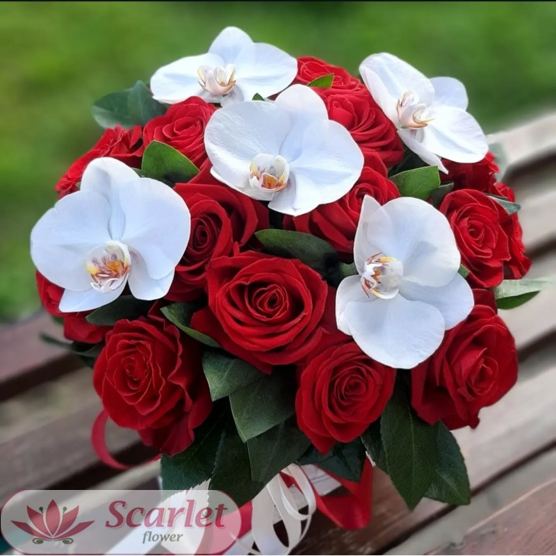Состав: розы 15 шт, цимбидиум 5 шт, зелень , коробка, оазис.