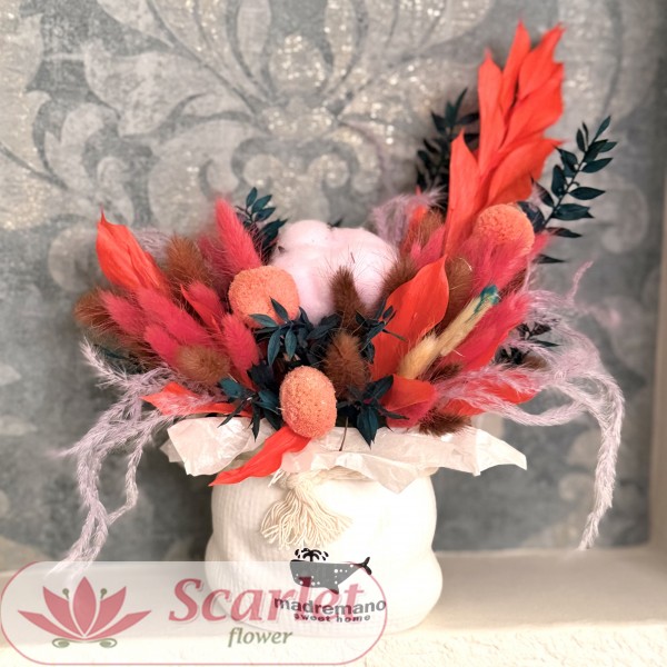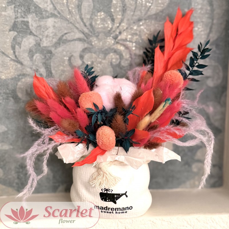 Состав: Хлопок, ларгус, каспедия, амарант, камыш, стабилизированный рускус, керамическое кашпо, оазис, декор. Размер :45*40см