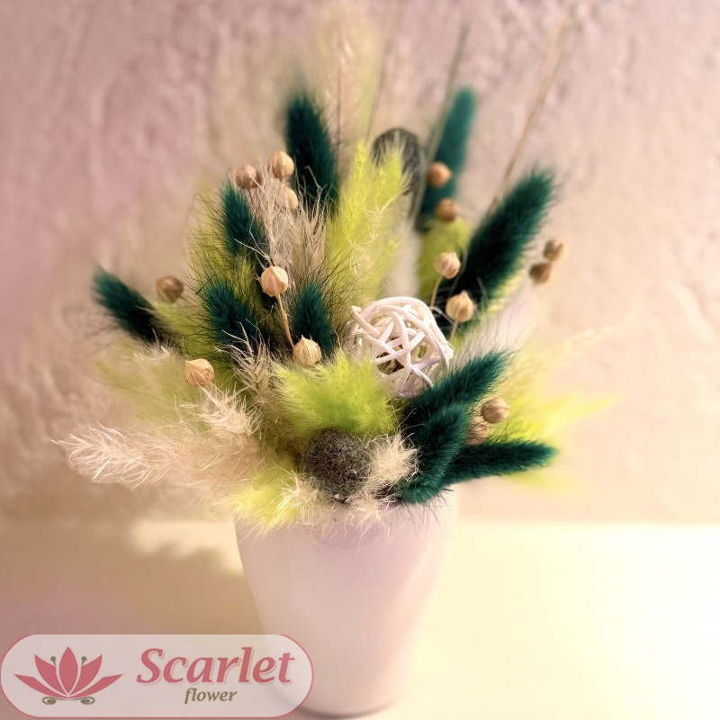 Состав ларгус, каркаде, камыш, лен, каспедия, декор из ротанга, керамическое кашпо, оазис. Размер :22*16см